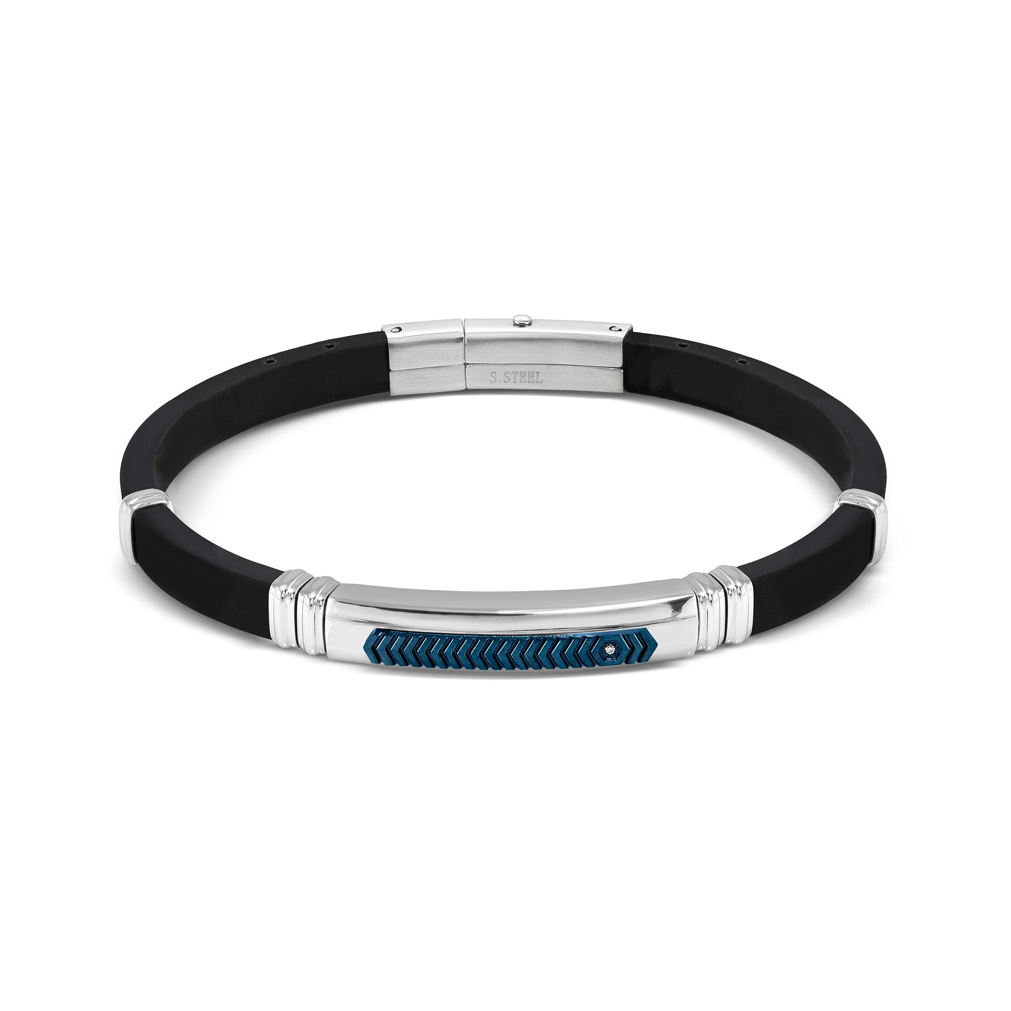 Bracelet in rubber and hypoallergenic stainless steel, blue PVD details and white cubic zirconia.
