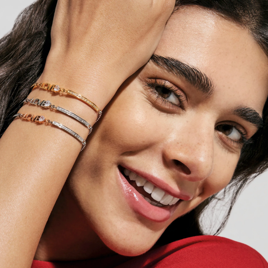 Stainless steel adjustable bracelet with white cubic zirconias, Love gold PVD plated symbol and details.