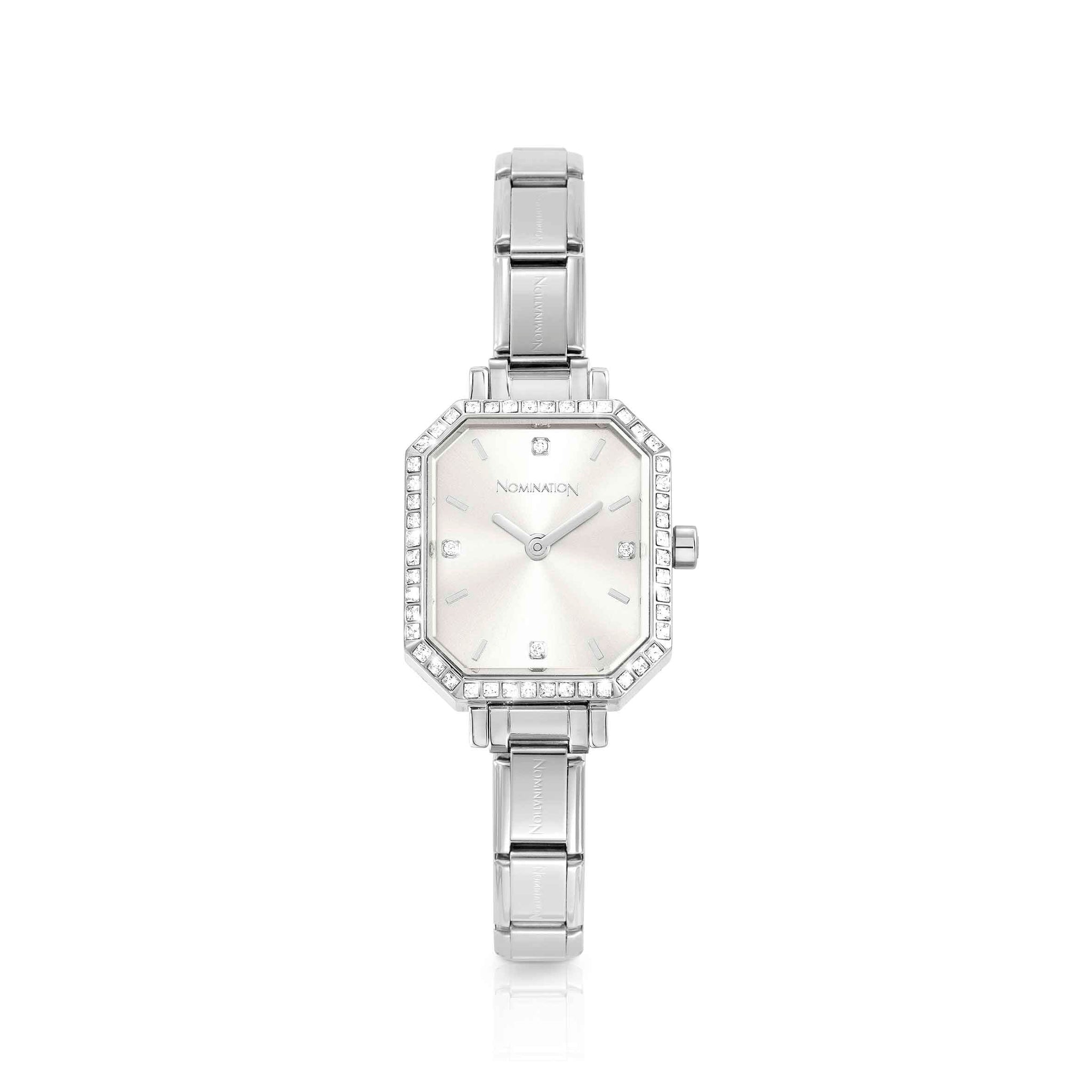 Paris Watch with Composable Classic Bracelet. Rectangular shaped case in stainless steel and Sunray Silver dial with Cubic Zirconias.