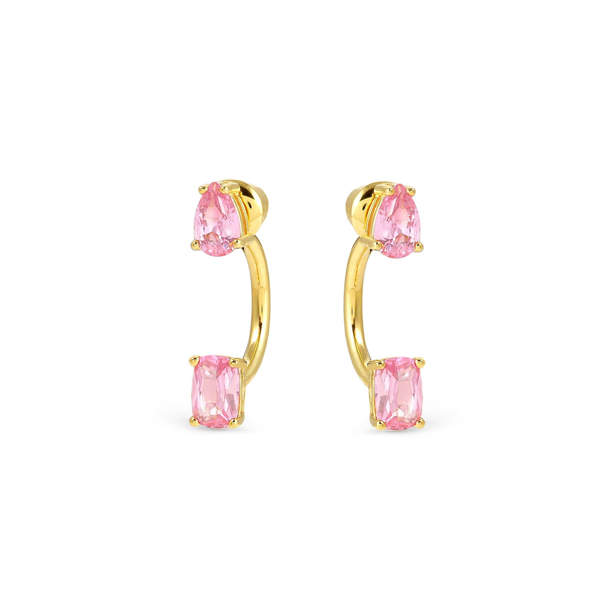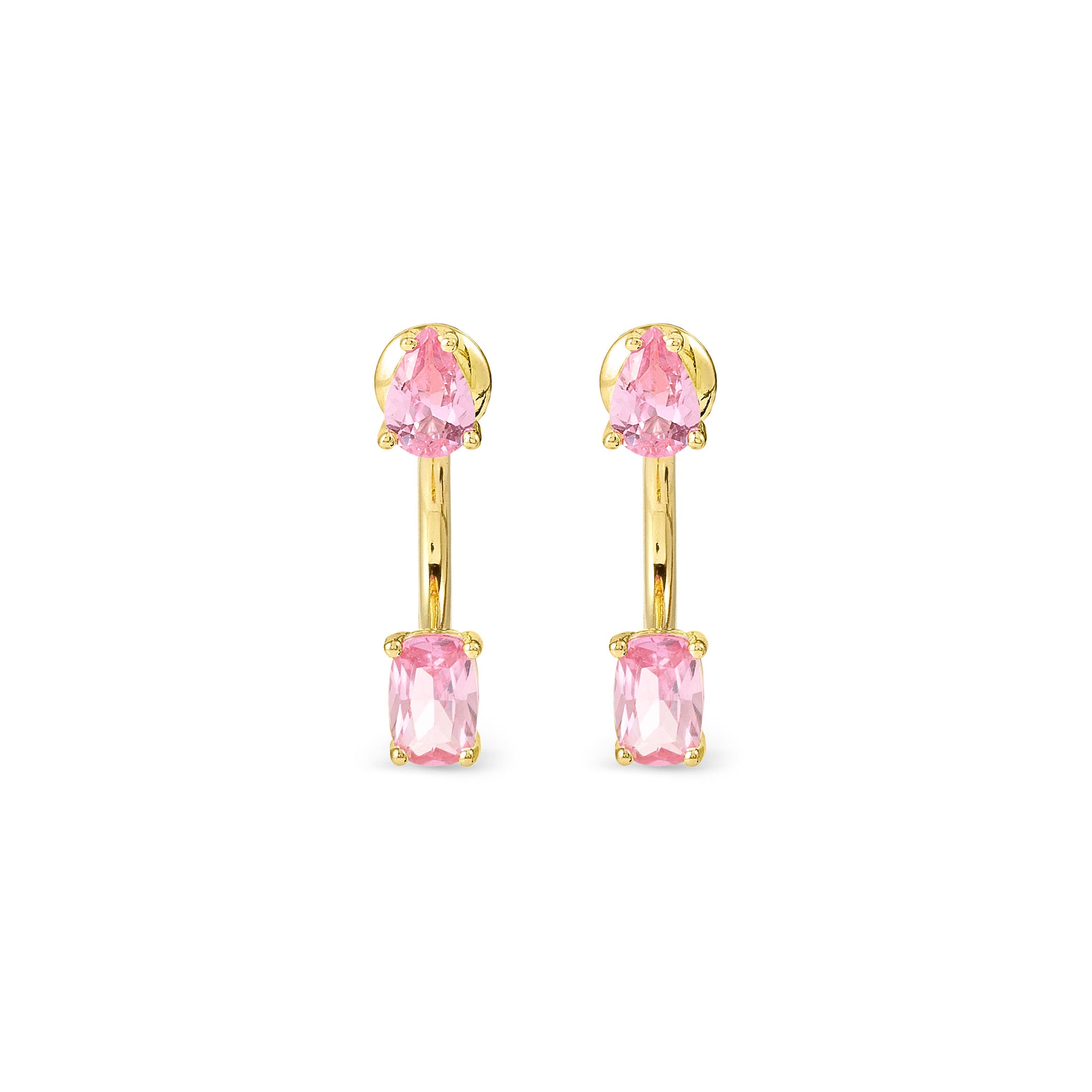 Elevate your everyday elegance with these 18k gold-plated sterling silver stud earrings, featuring two dazzling pink cubic zirconias, one tear drop, one oval. Their timeless design adds a sophisticated sparkle, perfect for both casual and formal occasions.