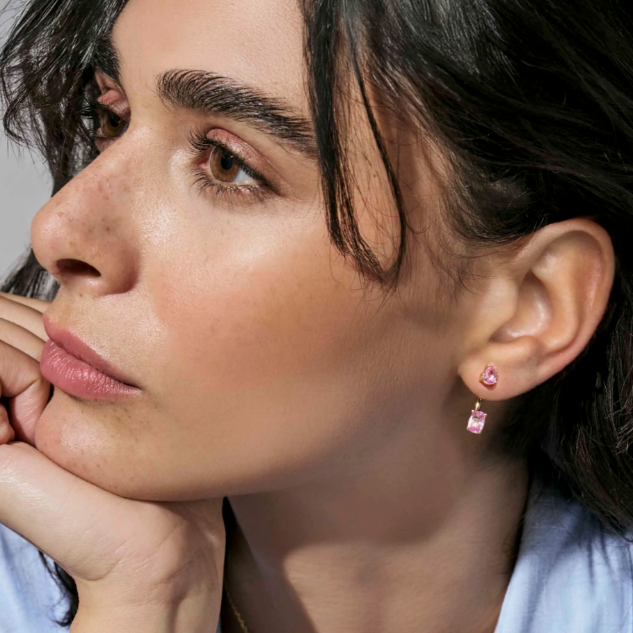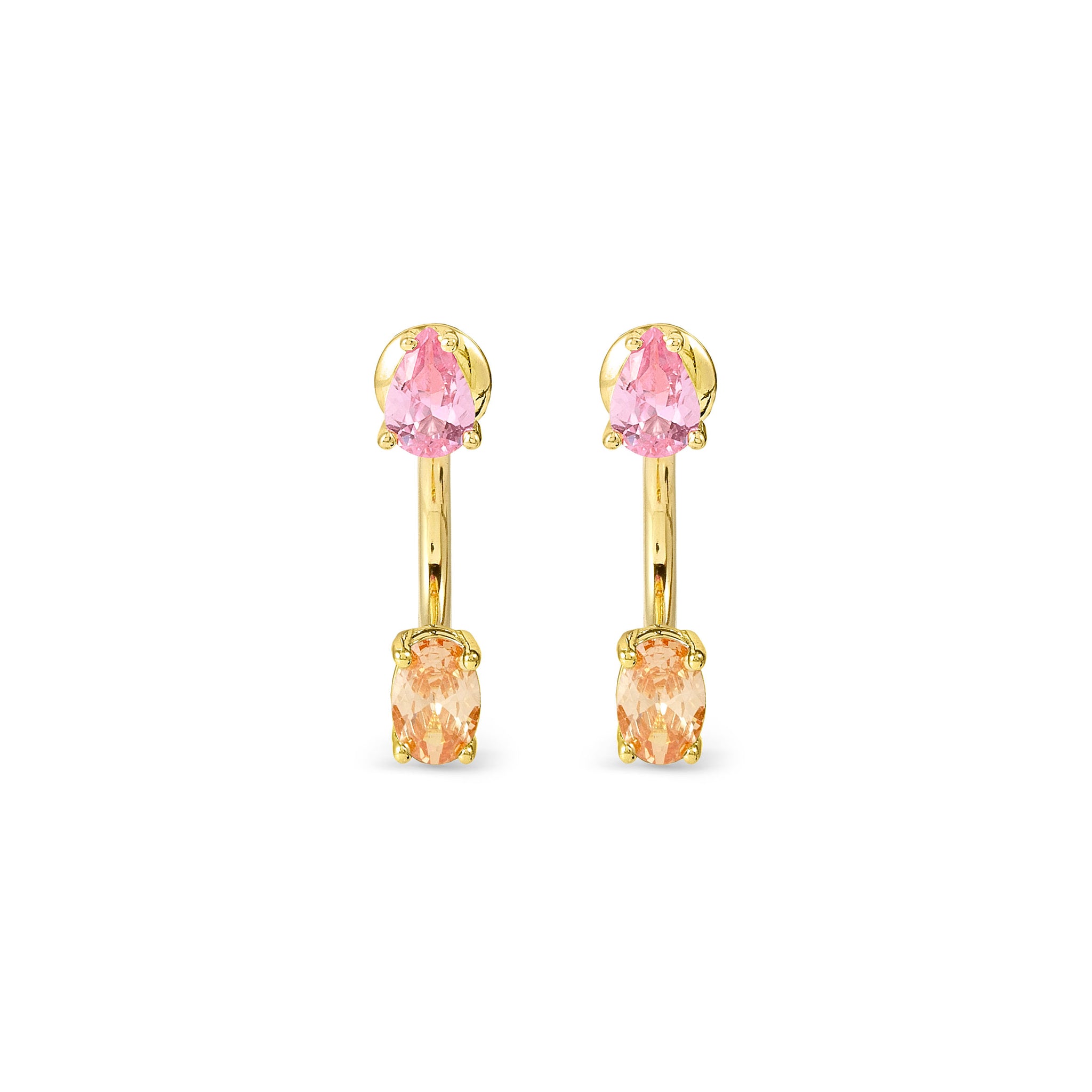 Elevate your everyday elegance with these 18k gold-plated sterling silver stud earrings, featuring two dazzling pink and champagne cubic zirconias, one tear drop, one oval. Their timeless design adds a sophisticated sparkle, perfect for both casual and formal occasions.