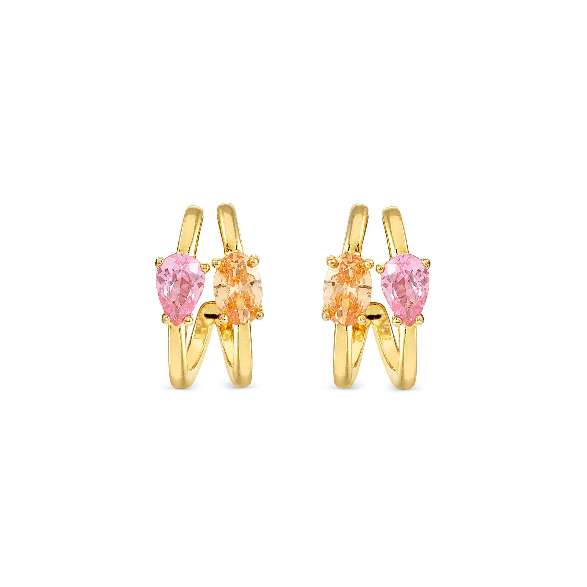 Elevate your everyday elegance with these 18k gold-plated sterling silver stud earrings, featuring dazzling pink and champagne oval and teardrop cubic zirconias. Their timeless design adds a sophisticated sparkle, perfect for both casual and formal occasions.