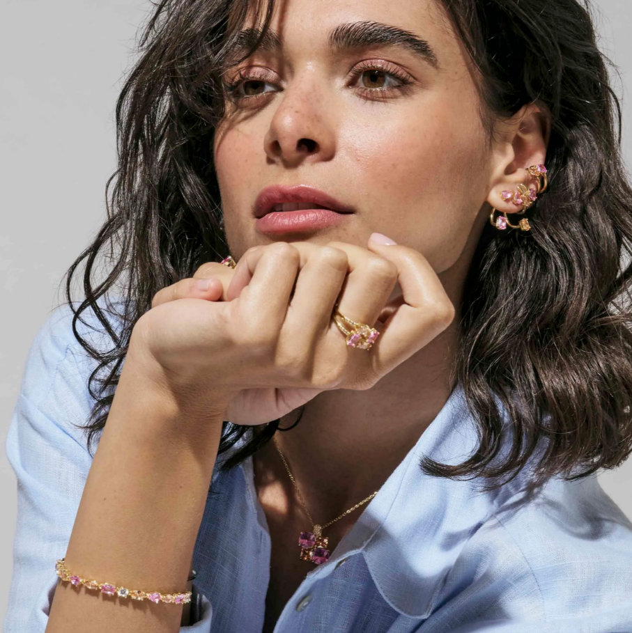 Colour Wave Collection offers a gold-plated sterling silver necklace with pink, champagne and white square cubic zirconias in a stylish pendant.