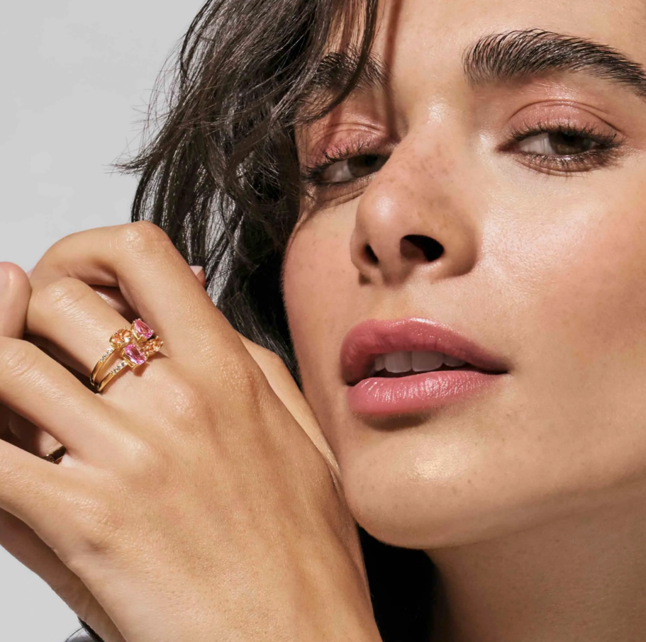 Colour Wave Collection offers a 18K gold plated, Sterling silver open design ring with pink, champagne and white Cubic Zirconias in a variety of shapes. The deep colours of these brilliant stones make this ring the perfect centerpiece for your special evenings.