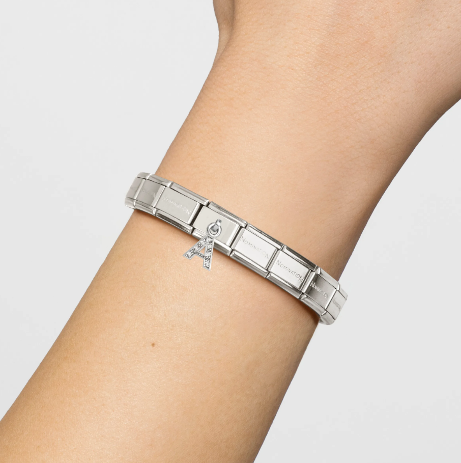 Original Composable Link for Nomination's Composable Classic Bracelet with Letter A pendant with Cubic Zirconias in sterling silver on stainless steel link.  Made in Italy.