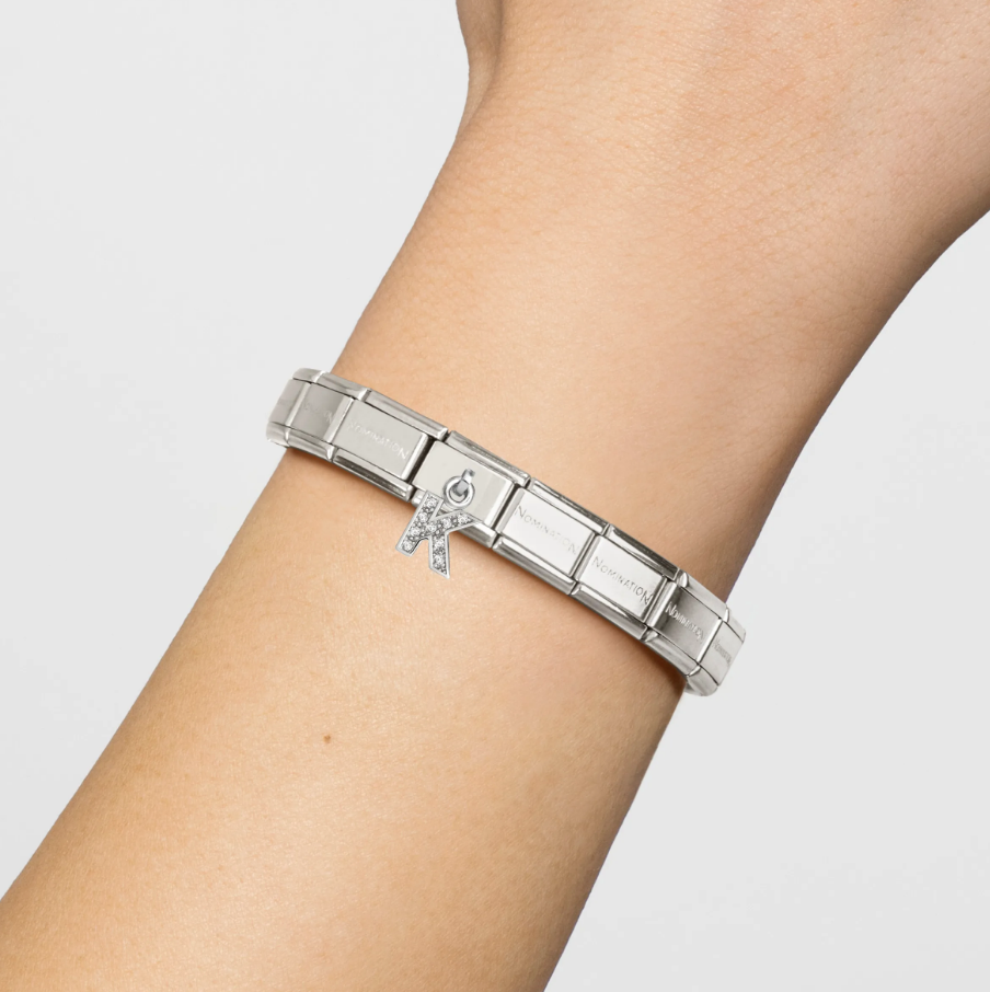 Original Composable Link for Nomination's Composable Classic Bracelet with Letter K pendant with Cubic Zirconias in sterling silver on stainless steel link.  Made in Italy.