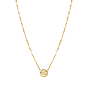 Cosmic Love sterling silver small circle pendant Necklace in eternity design with white cubic zirconias and 18k gold plated finish.