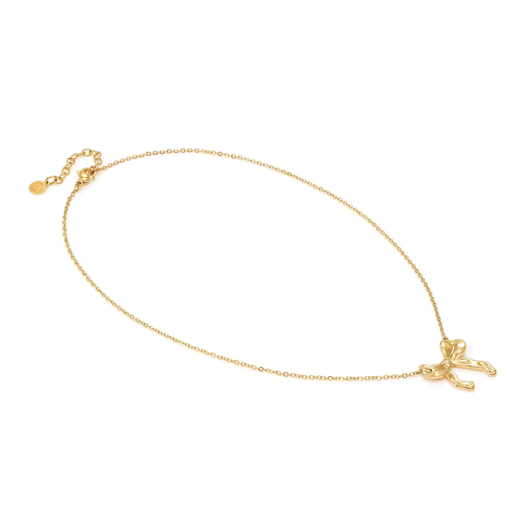 Make a statement with the Ecclettica gold PVD Stainless Steel Bow necklace. This elegant design features a pretty golden stainless steel bow pendant, adding a touch of sophistication and class to any outfit. The durable stainless steel material ensures long-lasting wear, making it a timeless piece in your jewellery collection.
