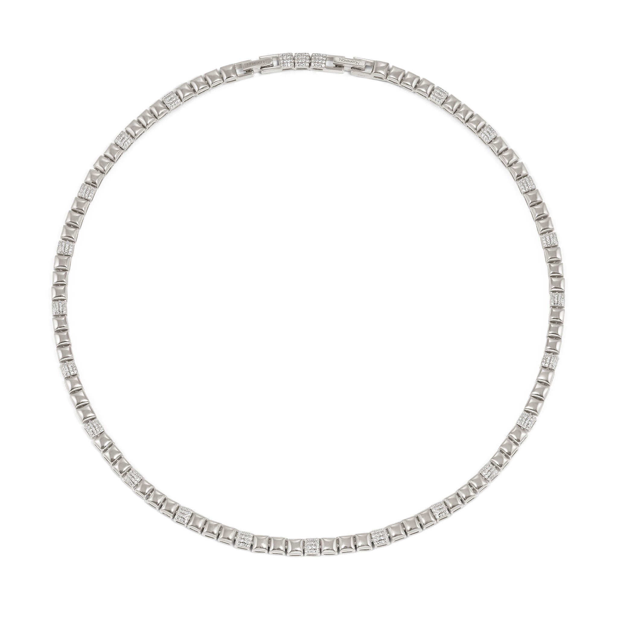 Elevate your style with the Enigmatic Shine Necklace, crafted in sterling silver for lasting elegance. Featuring a sleek geometric design adorned with squares pavé set with sparkling white Cubic Zirconias at regular intervals around the necklace, it catches the light beautifully, adding a touch of sophistication to any outfit.