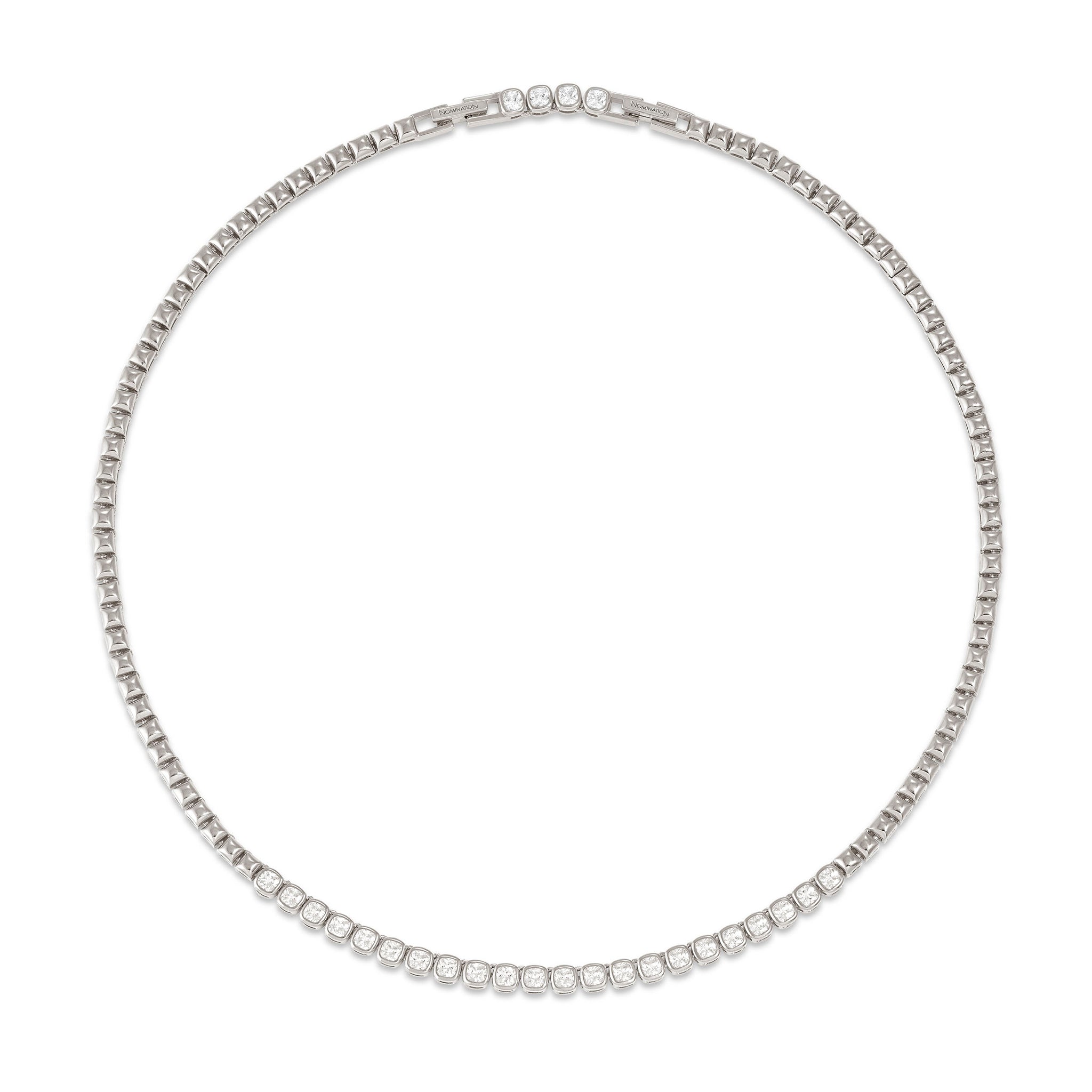 Elevate your elegance with the Enigmatic Shine Ornate Necklace, crafted in sterling silver and adorned with a row of dazzling geometric white cubic zirconia stones. This collier-style design seamlessly blends sophistication with sparkle, making it a perfect statement piece for any occasion. Its radiant stones catch the light beautifully, adding a touch of timeless charm to your look.