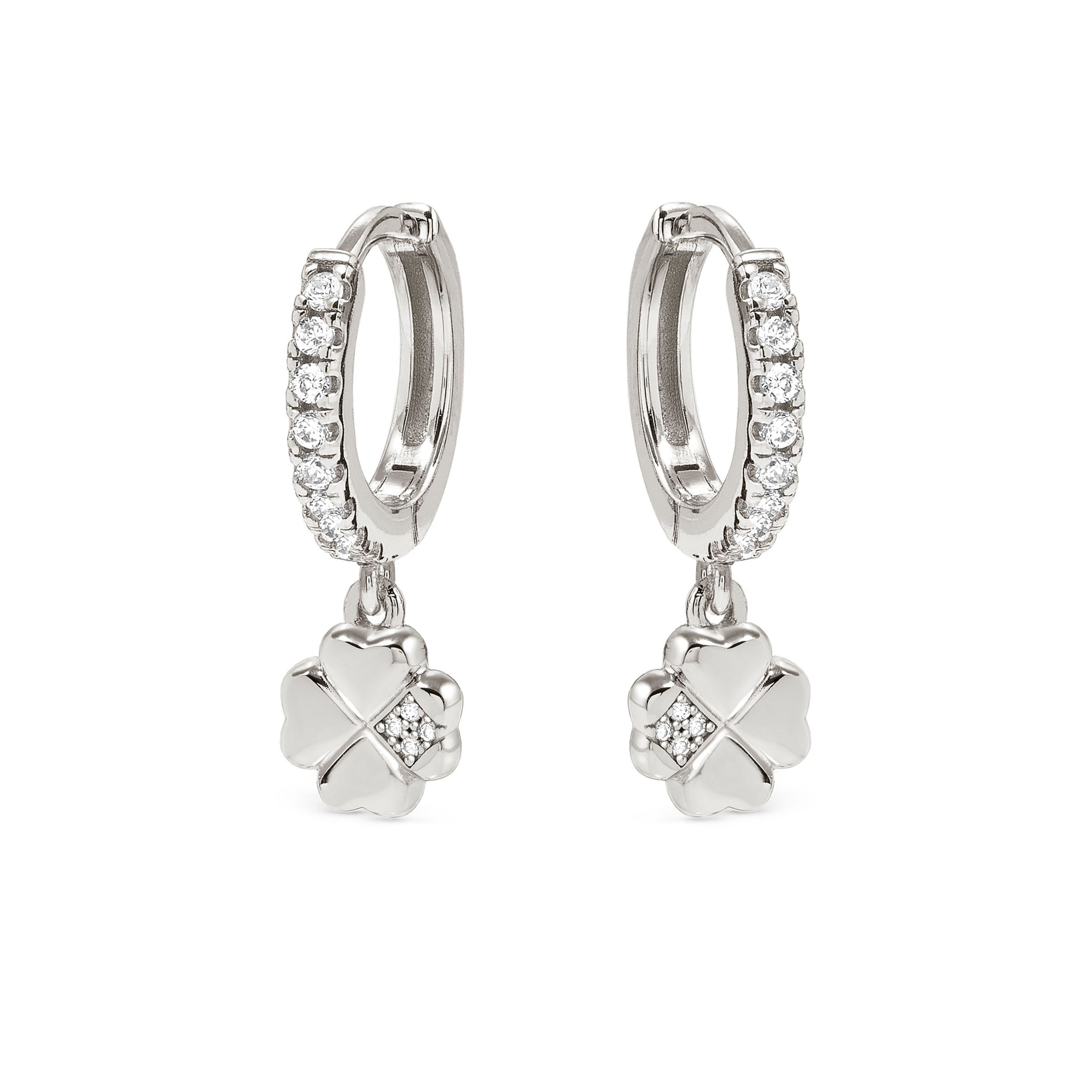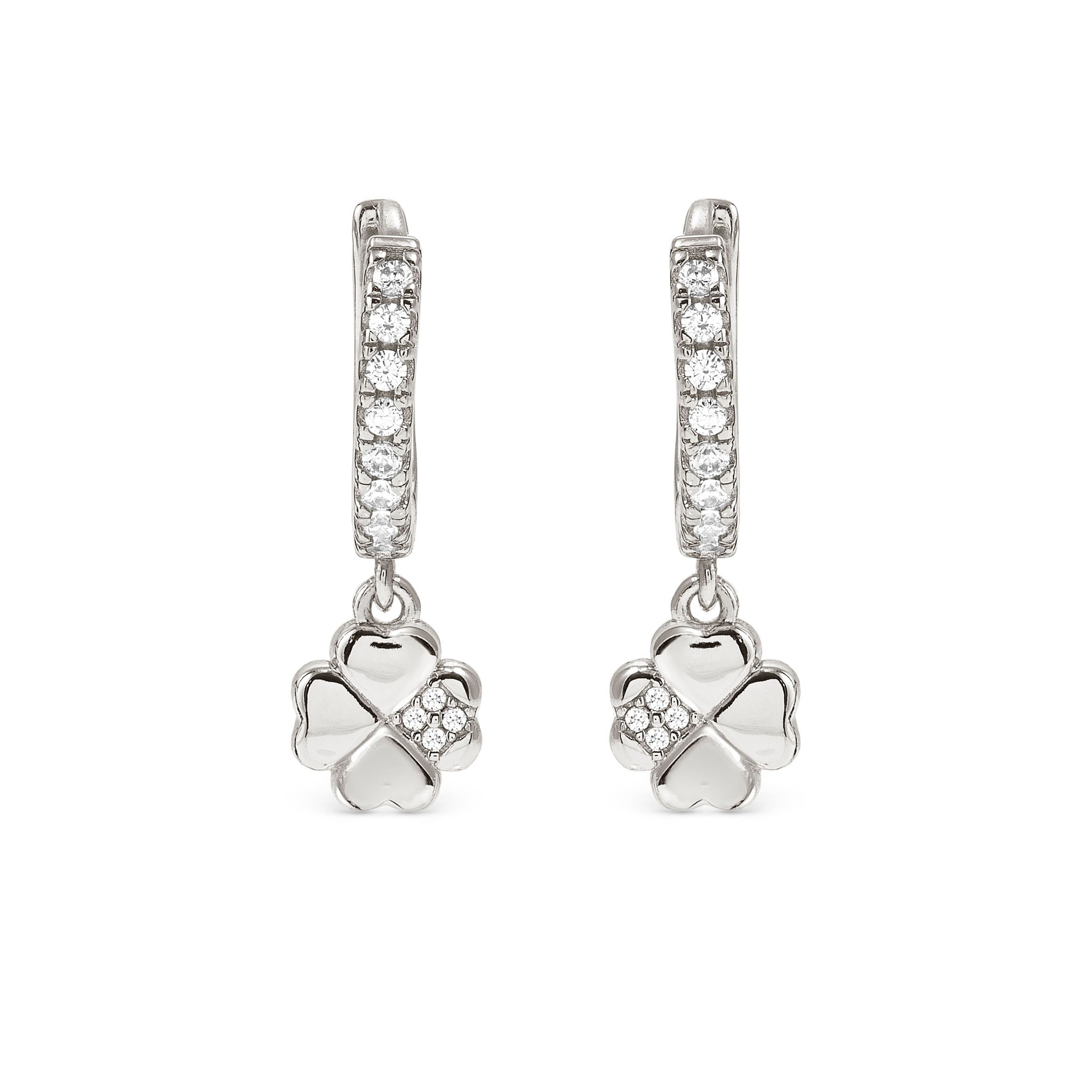 Elevate your everyday look with these sterling silver hoops featuring sparkling white cubic zirconias and a charming dangling four-leaf clover pendant.
