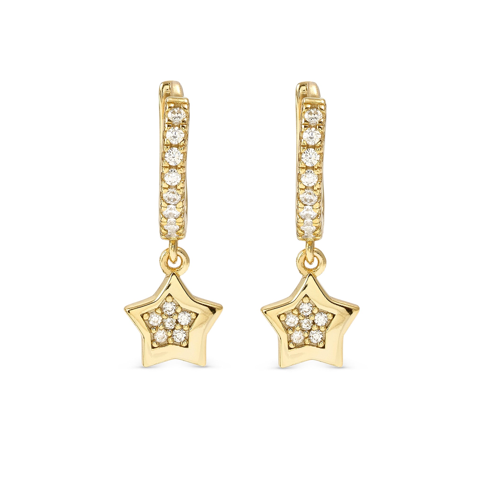 Elevate your everyday look with these 18k gold plated sterling silver hoops featuring sparkling white cubic zirconias and a charming dangling star pendant.