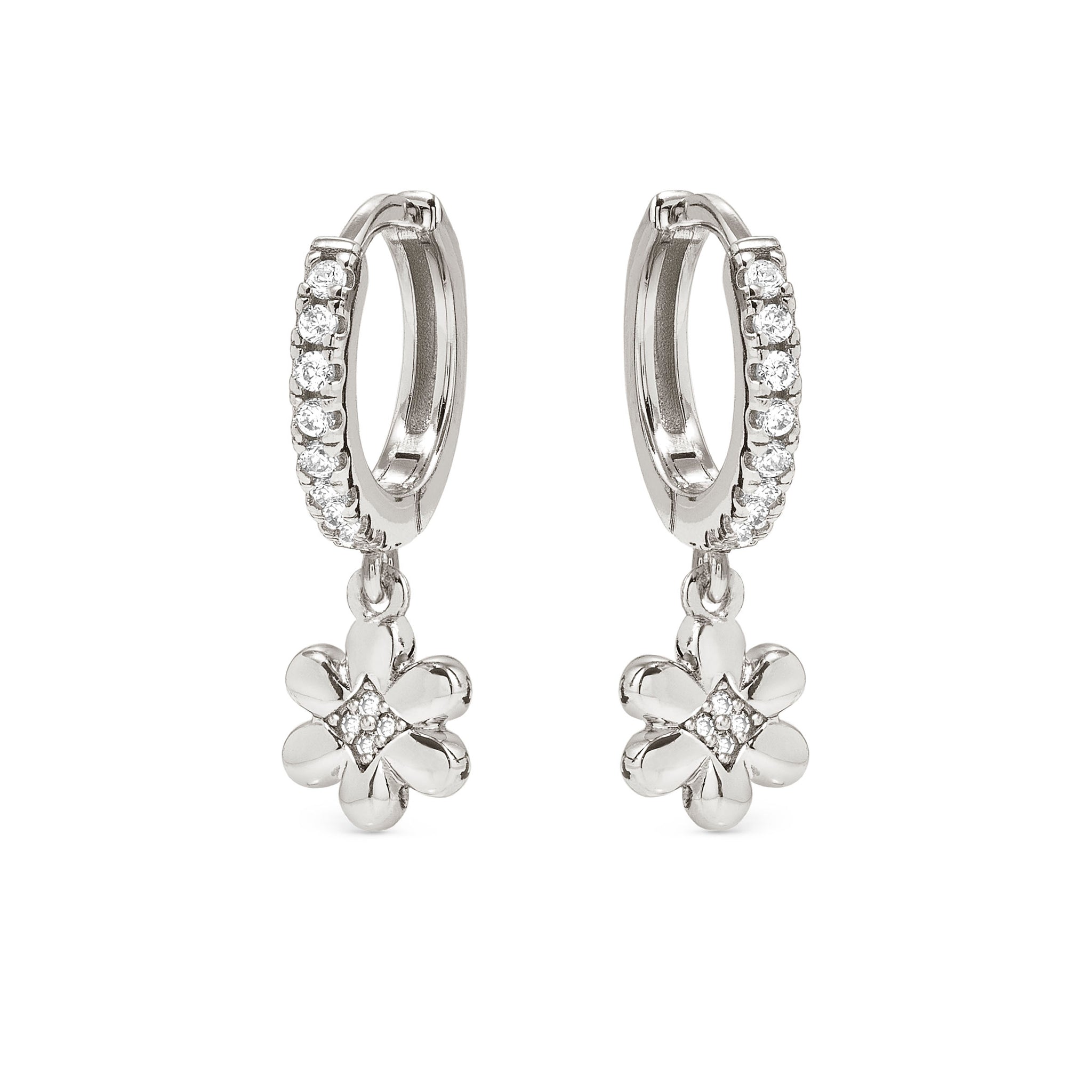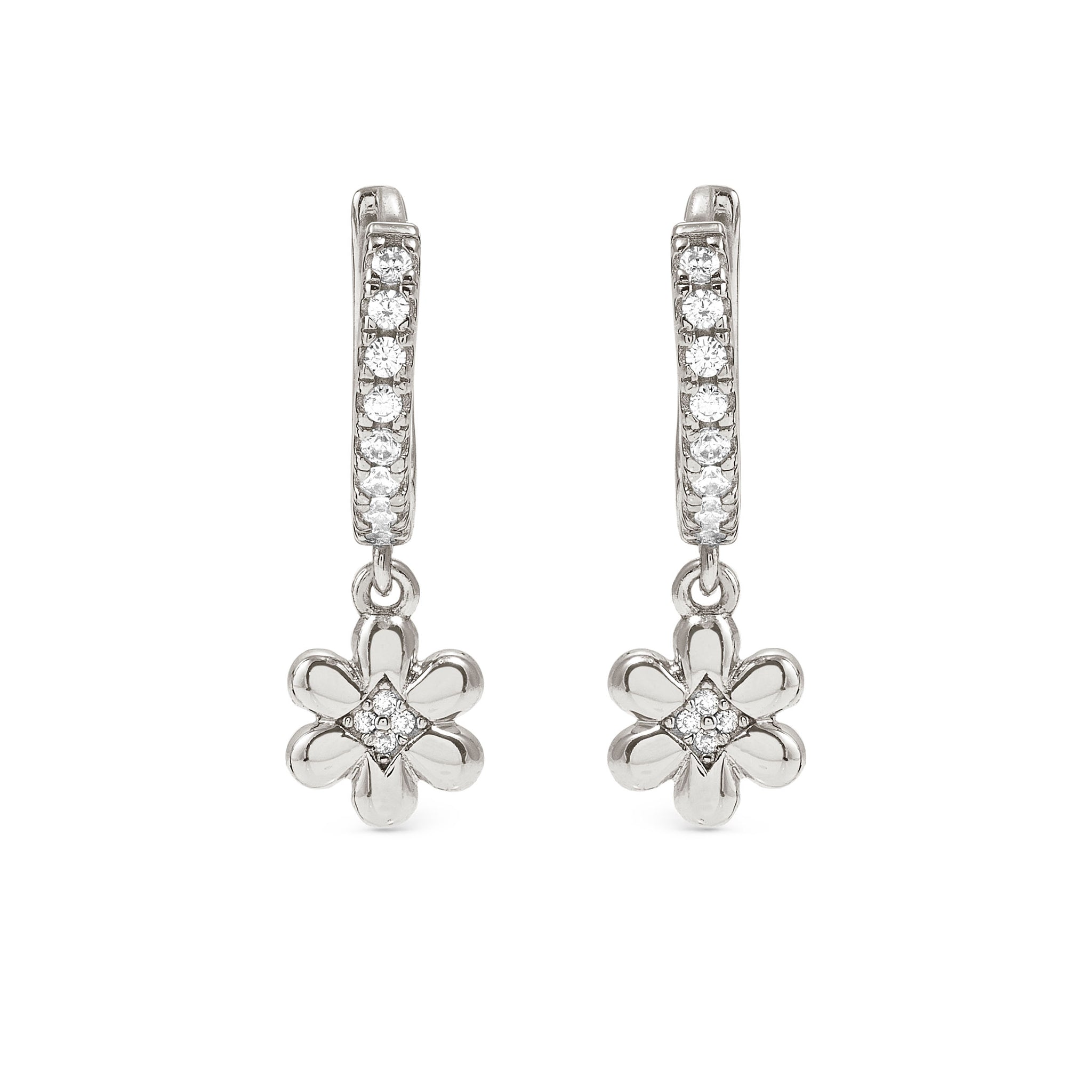 Elevate your everyday look with these sterling silver hoops featuring sparkling white cubic zirconias and a charming dangling flower pendant.