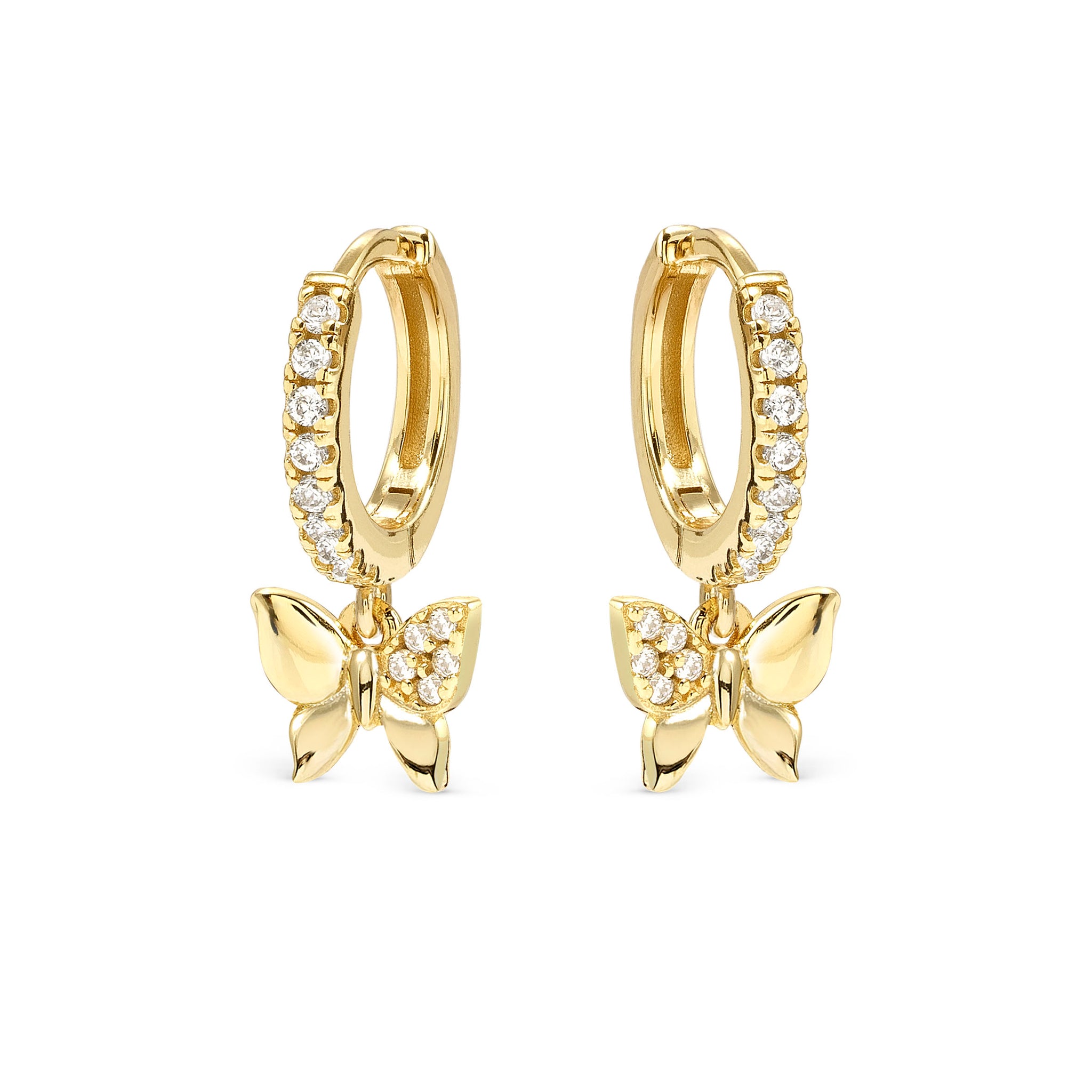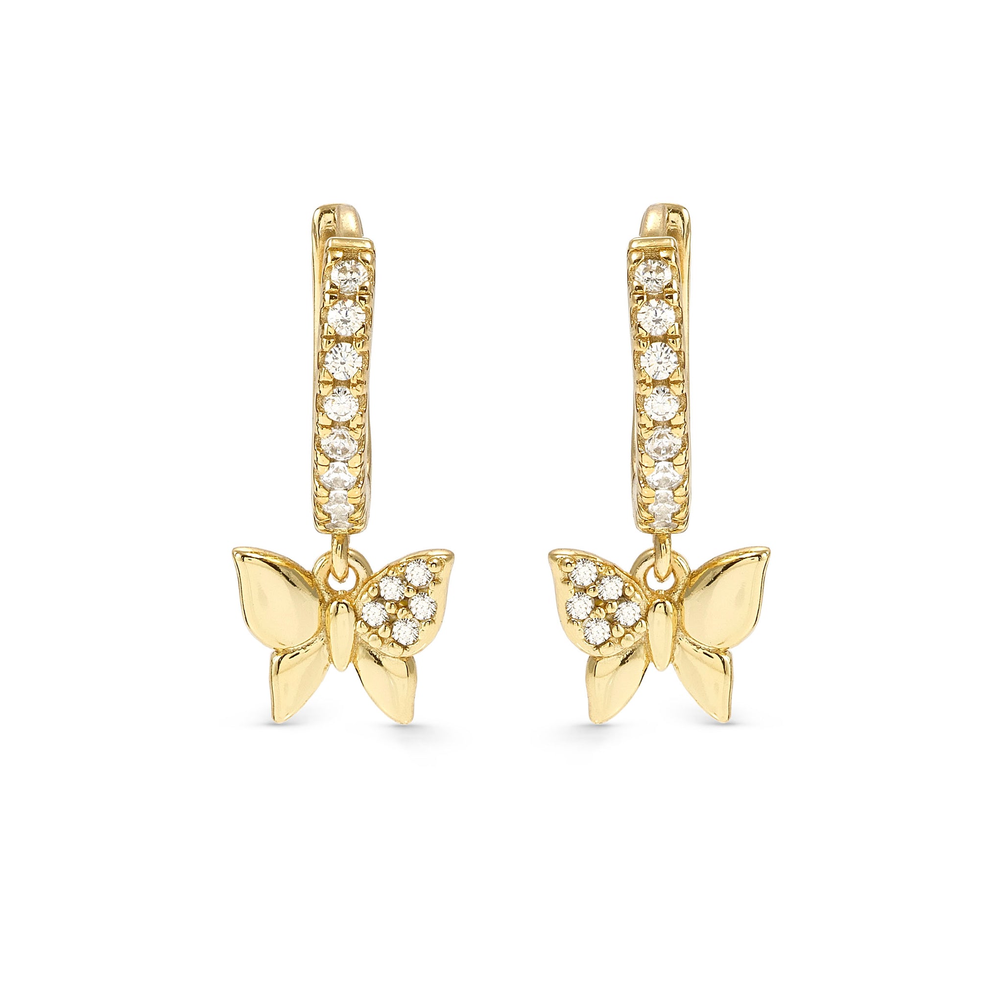 Elevate your everyday look with these 18k gold plated sterling silver hoops featuring sparkling white cubic zirconias and a charming dangling butterfly pendant.