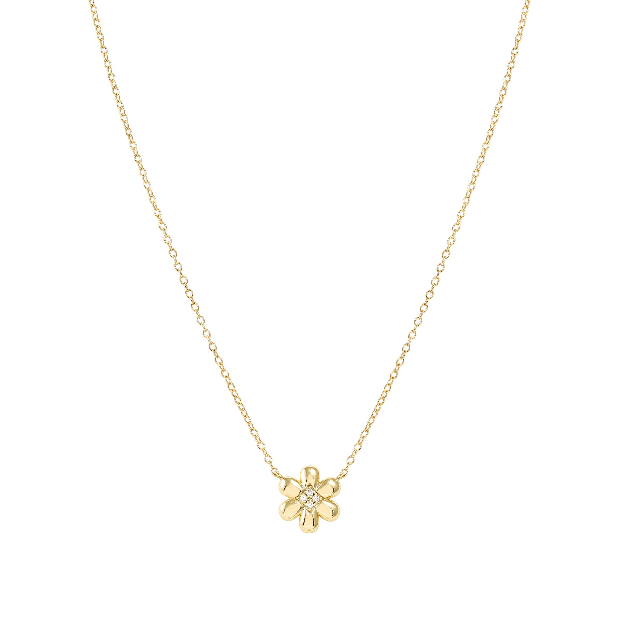Elevate your elegance with the Petit Sparkle Necklace, featuring an 18k gold-plated sterling silver flower pendant accented by shimmering white cubic zirconias. This delicate piece adds a radiant touch to any outfit, perfect for everyday wear or special occasions.
