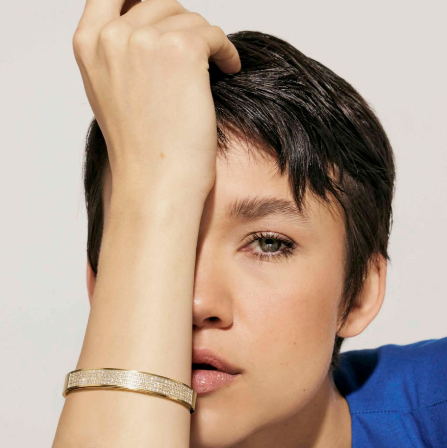 This stainless steel wide bangle is perfect for stacking adorned with sparkling pavé set cubic zirconia details. Hinged on one side and a hidden fastening that snaps securely closed on the other. Add a touch of elegance to any outfit with Pretty Bangles.